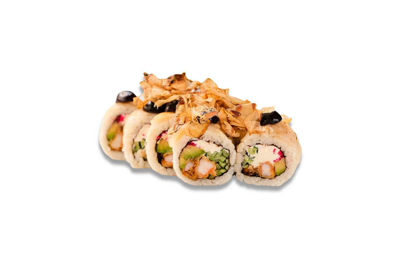 Гребінець,креветка тигрова ,авокадо,огірок, стружка тунця,вишня амарена, крем-сир, ікра тобіко червона,сухарі панко,рис, норі,лист бамбука,соус соєвий унагі, мікрогрін.