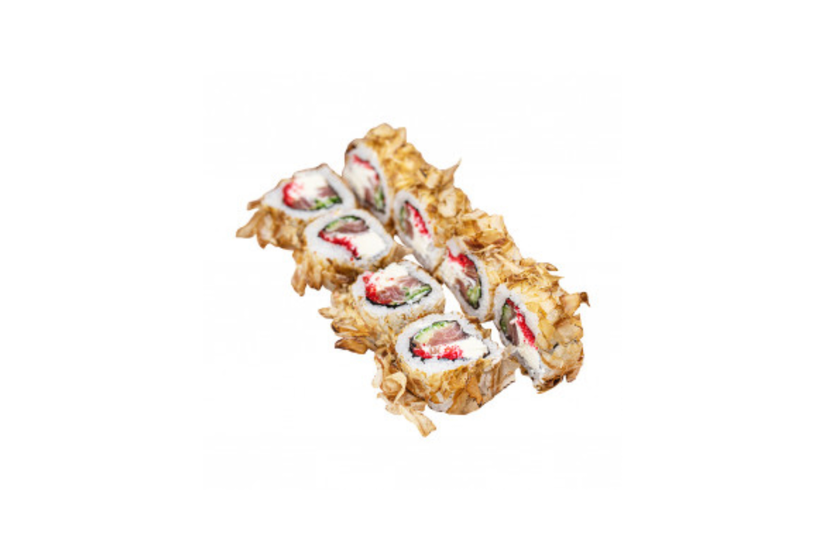 Тунець, ікра тобіко, соус спайсі, стружка тунця, крем-сир, огірок, норі, рис