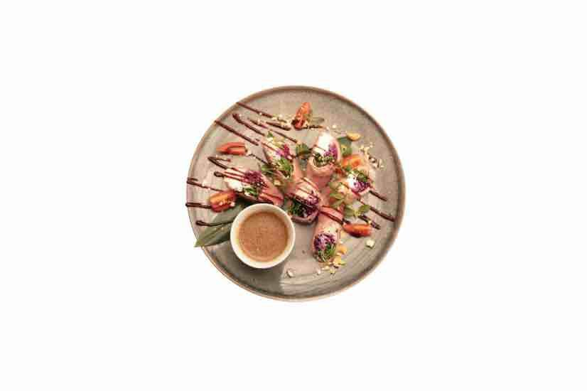 Качине філе,капуста синя,заправка пікантна,руккола,крем сир,рисовий папір.