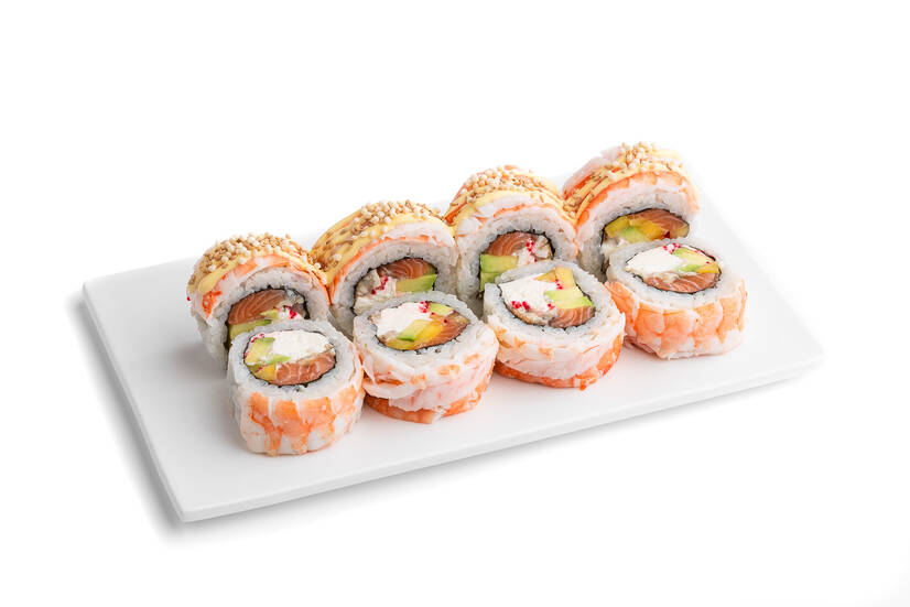 Креветка, вугор,лосось, авокадо, крем-сир, тобіка чорна, манго, ікра, кунжут, соус унагі, рис, норі
