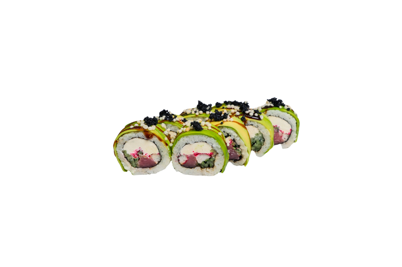 Авокадо, вугор,тунець, огірок, крем-сир, тобіко чорна, тобіко червона, мікрогрін, кунжут, соус унагі, рис,рисові кульки.