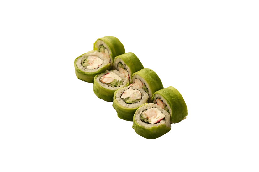 Креветки тигрові, ис, норі, крем-сир, ікра тобіко червона, авокадо, кунжут білий