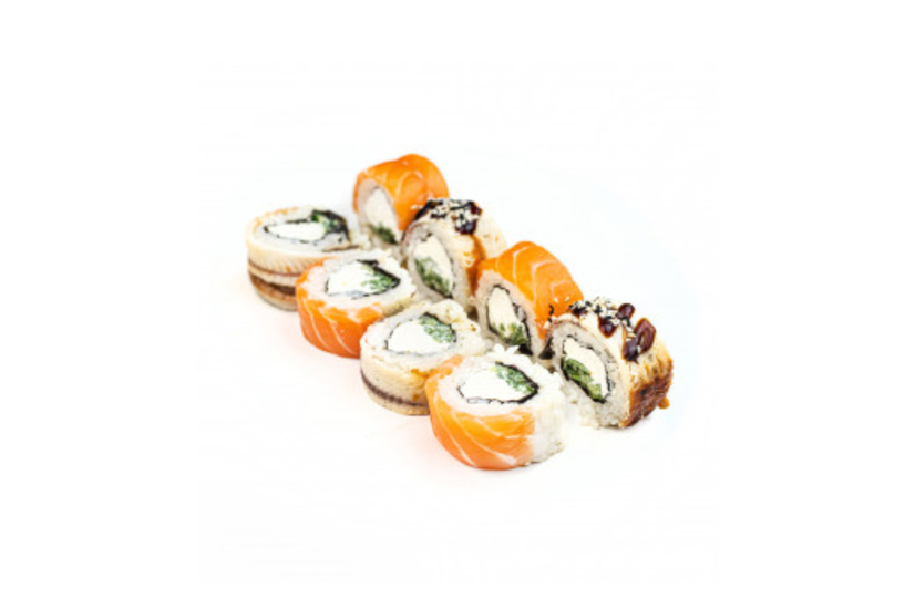 Лосось, вугор, унагі, крем-сир, огірок, кунжут, норі, рис