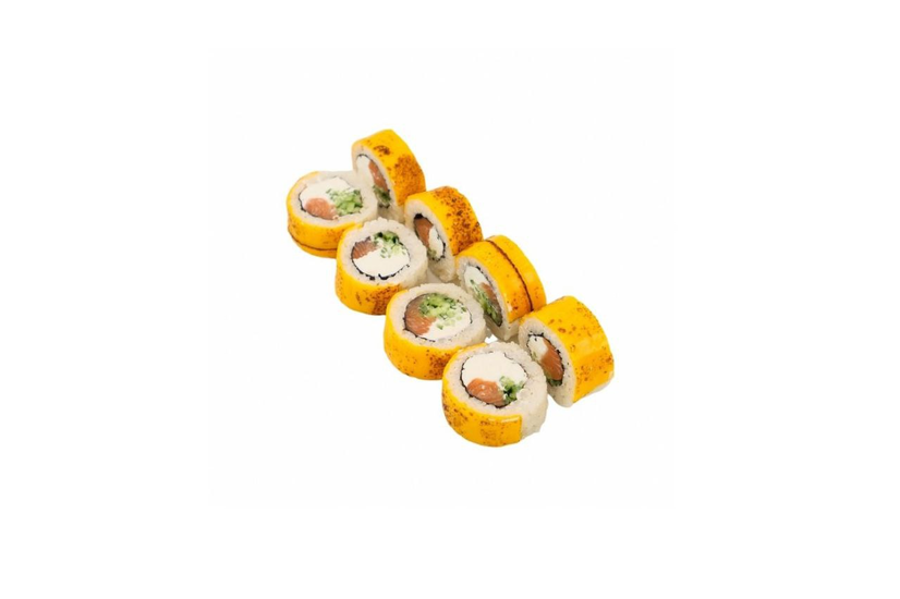 Слабосолений лосось, крем-сир, огірок, сир чеддер, норі, рис, соус унагі