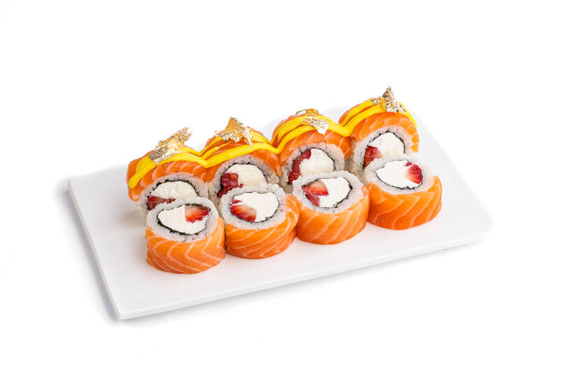 Лосось, полуниця, крем-сир, норі, рис ,соус аліолі з манго.