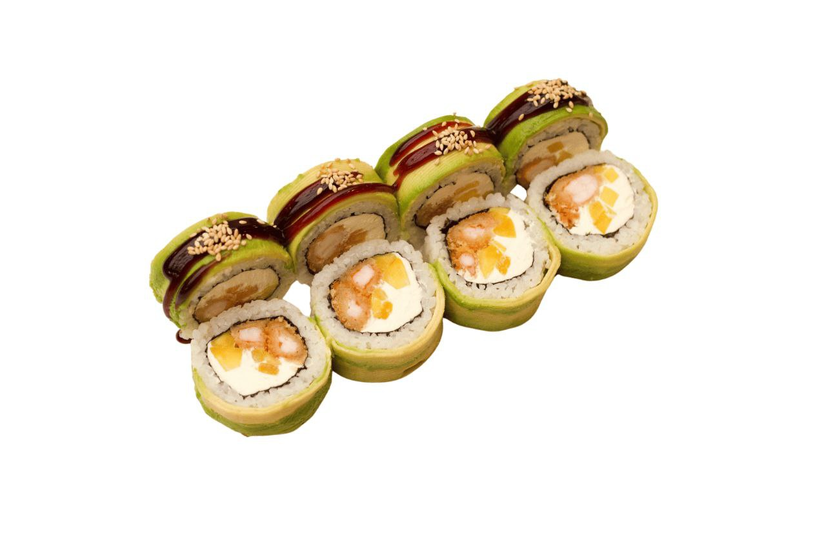 Креветки тигрові,сир вершковий,манго,авокадо,соус унагі,кунжут,рис ,норі,горіхи кешью.
