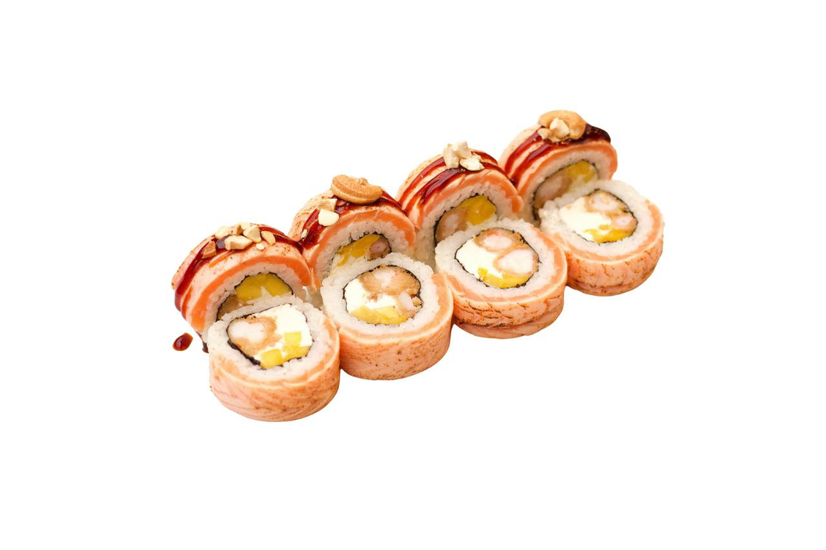 Лосось свіжий,сир вершковий,манго,креветки тигрові,соус унагі,горіхи кешью,рис ,норі.