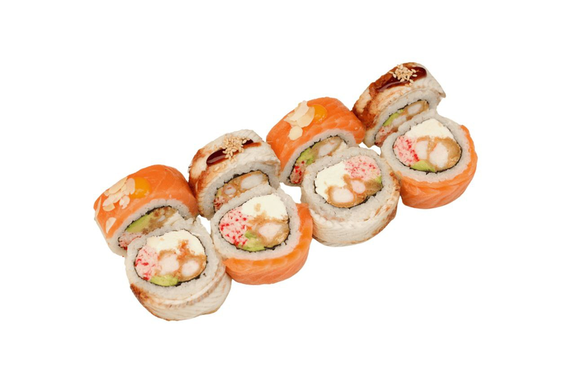 Лосось свіжий,вугор смажений,креветки тигрові,авокадо,сир вершковий,сніжний краб,рис,норі.соус спайс,ікра тобіко червона,соус унагі ,соус манговий.