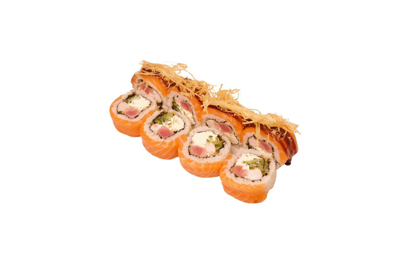 Тунець,лосось свіжий,креветки тигрові,сир вершковий,огірок,тісто катаіфі,соус солодкий васабі,рис,норі.