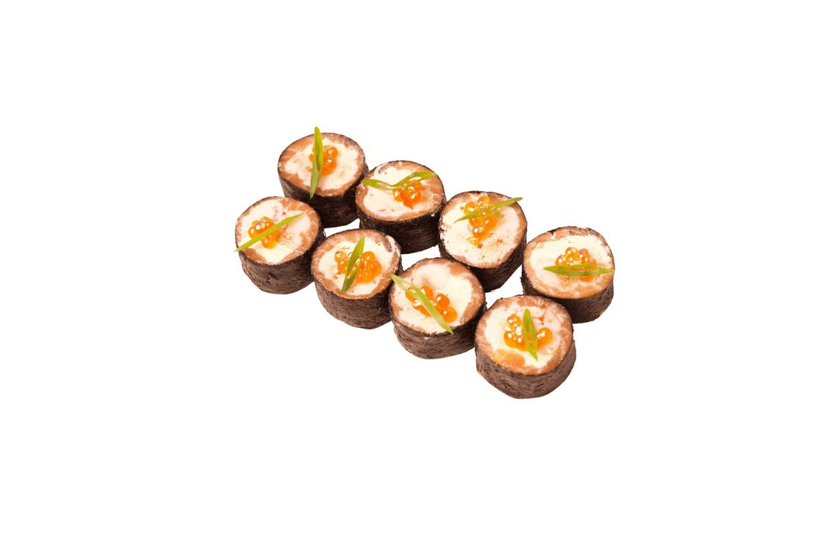 Лосось свіжий,креветки тигрові,сир вершковий,сніжний краб,ікра лососева,цибуля зелена,норі.