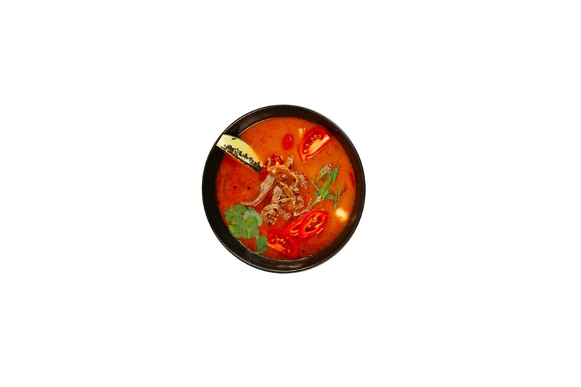 Молоко кокосове, помідори черрі, гриби печериці,яловичина, бульйон рибний,кінза,лемонграс,томатна паста,локшина скляна хурасаме.