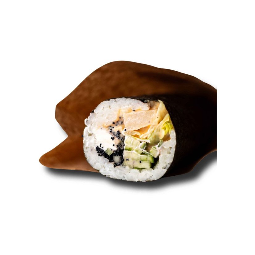 Медальйони морських гребінців, крем сир, салат айзберг,огірок,соус спайсі, соус сметаний, рис, норі,ікро тобіко чорна.