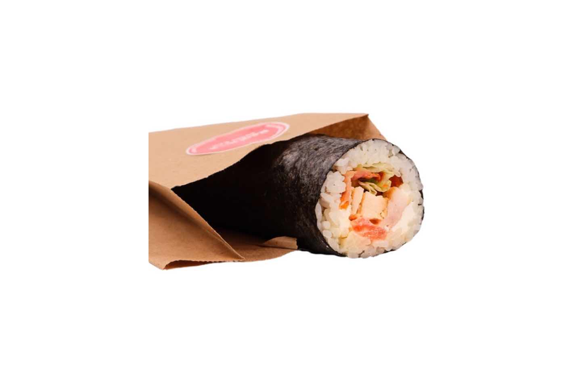 Куряче філе,бекон, крем сир, салат айзберг,помідор, соус цезарь, рис, норі