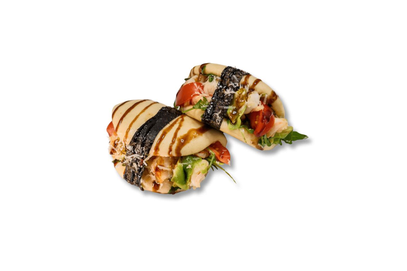 Креветки тигрові, парова булочка бао, рукола,соус цезар , крем сир, томати чері, пармезан