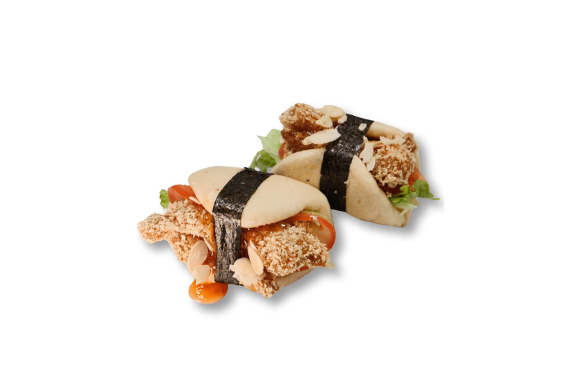 Креветка тигрова, парова булочка бао,крем-сир, салат айсберг,томати, сухарі панко, соус солодкий чилі, мигдалеві пластивці
