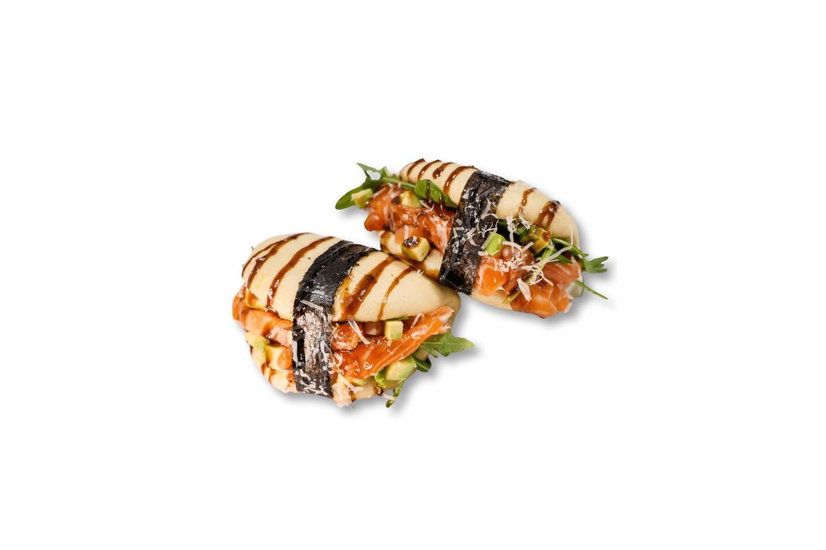 Лосось, парова булочка бао, лист салата,заправка піканта, крем сир,авокадо, томати чері, пармезан