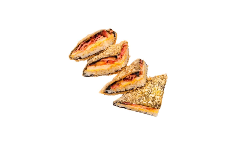 Курка, сир чедер, бекон, айсберг,помідор, соус цезарь, сухарі панко, норі, рис