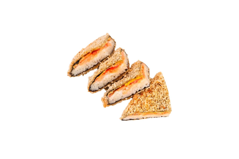 Лосось, сир чедер, крем сир, айсберг,помідор, сухарі панко, норі, рис