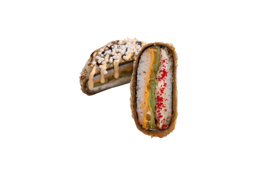 Вугор, сир чедер, манго, норі, авокадо, крем-сир, рис, сухарі панко, ікра тобіко, соус сирний, соус унагі, повітряні рисові кульки.