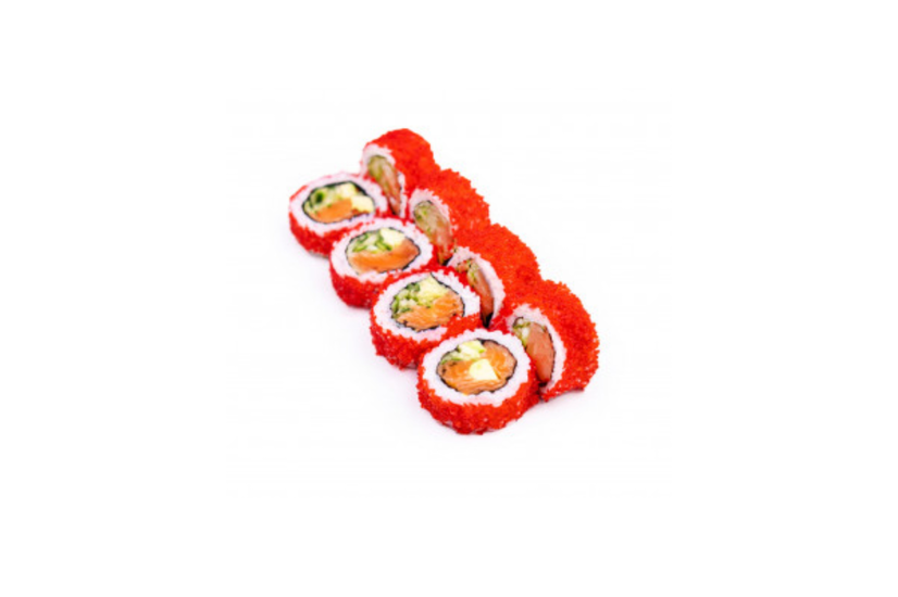 Лосось, огірок, авокадо, червона ікра тобіко, норі, рис