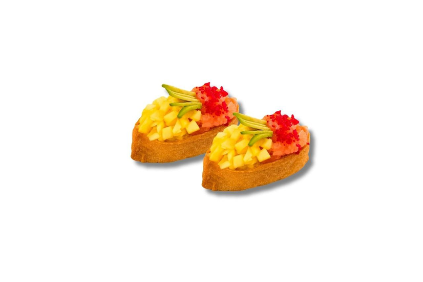 Рис, сир соєвий інарі, крем сир, лосось, манго, ікра тобіко червона, соус манговий, авокадо