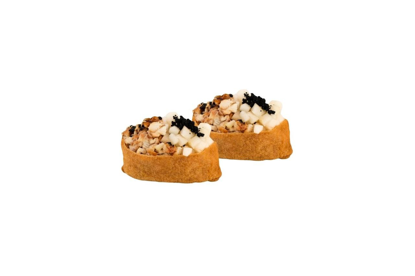 Рис, сир соєвий інарі, крем сир, вугор, груша, ікра тобіко чорна, кунжут білий