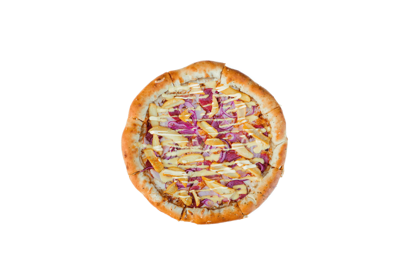 Бекон ,салямі,сир моцарела,соус BBQ,цибуля кранч,картопляні діпи,соус сирний,цибуля синя, балик свинний.