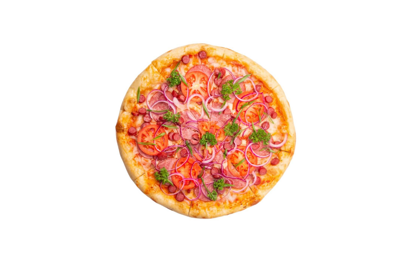 Баварські ковбаски, салямі піканте, маринована цибуля, помідор, зелена цибуля, соус маринара, сир моцарела, петрушка