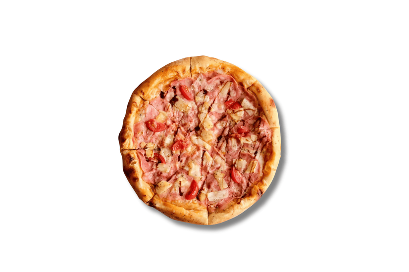 Балик свинний, сир моцарелла, соус цезар, маринара соус, пармезан, орегано сушене,ананаси,вершковий соус,томати черрі.