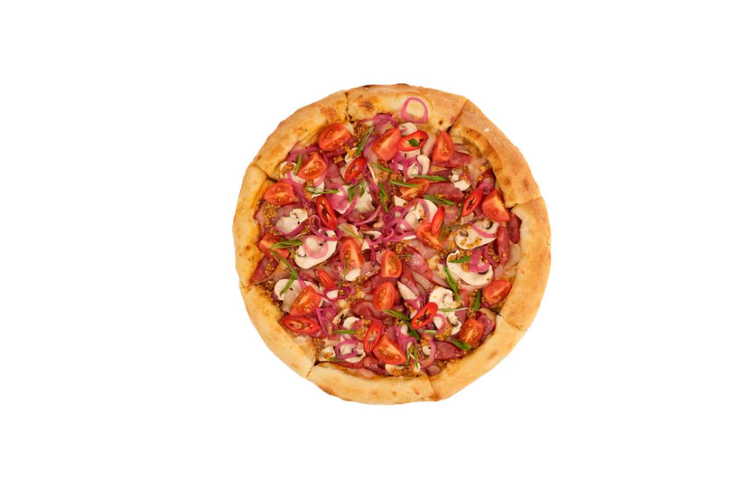 Ковбаски мисливські, бекон, гриби шампіньйони, сир моцарелла, помідори чері, соус маринара, цибуля зелена, цибуля синя, діжонська гірчиця, перець чилі
