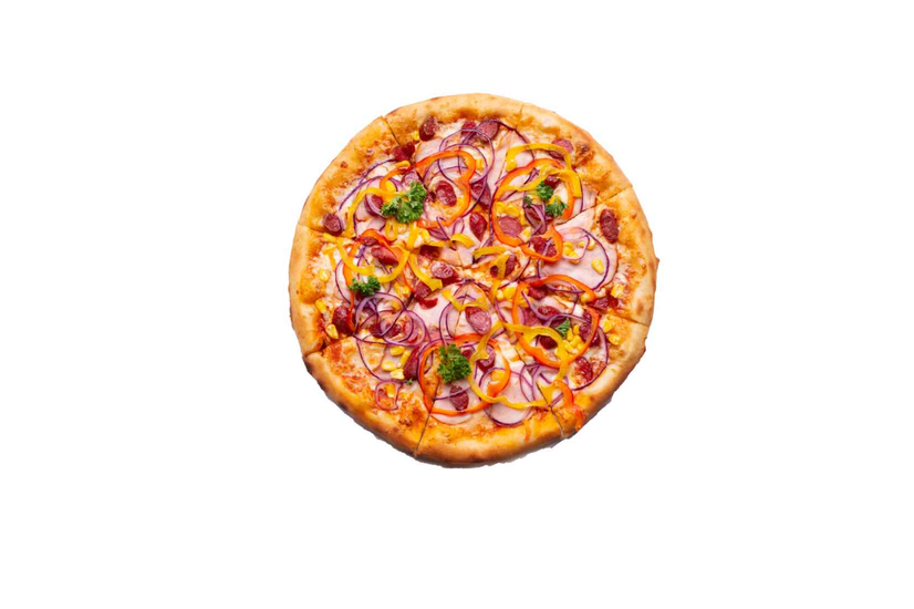 Ковбаски мисливськи, куряче філе копчене, сир моцарела,синя цибуля, болгарський перець,кукурудза, соус маринара,соус барбекю