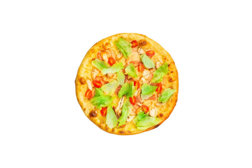 Куряче філе смажене, бекон,салат айсберг, помідори чері, сир моцарела,сир пармезан, соус цезар.