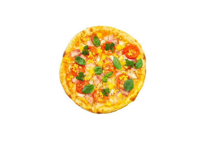 Куряче філе смажене, бекон, соус Маринара, ананас, кукурудза, помідори, сир моцарела, вершковий соус, петрушка, базилік
