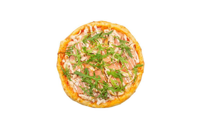 Куряче філе смажене, балик свинний, бекон, гриби шампіньйони, сир моцарелла, помідори, соус маринара, соус цезар, рукола.