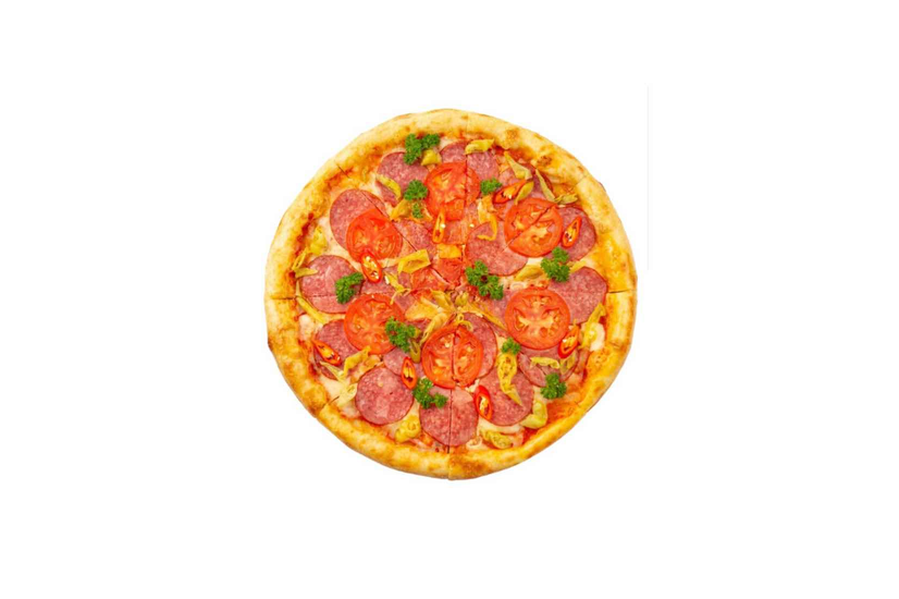 Салямі піканте, перець пепероні, перець чилі, помідори, сир моцарела, соус Маринара, петрушка, орегано