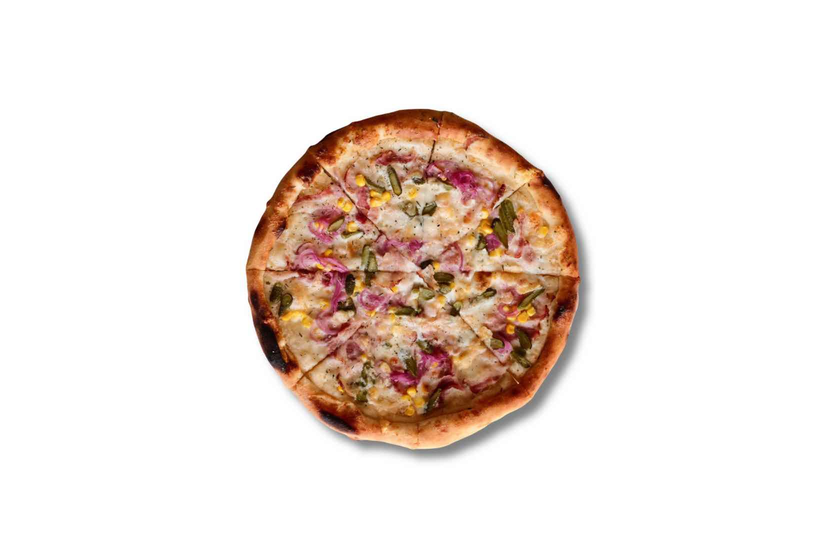 Бекон свинний, сир моцарелла, соус цезар, вершковий соус,сир пармезан, орегано сушене,цибуля синя,огірки мариновані,кукурудза,