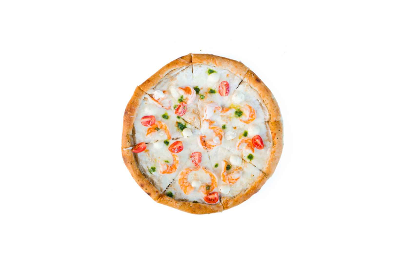 Креветки тигрові,сир моцарела ,вершки, сир вершковий,сир пармезан,томати чері,пудра маслин,лимон.