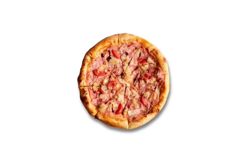 Балик свинний, сир моцарелла, соус цезар, маринара соус, пармезан, орегано сушене,ананаси,вершковий соус,томати черрі.