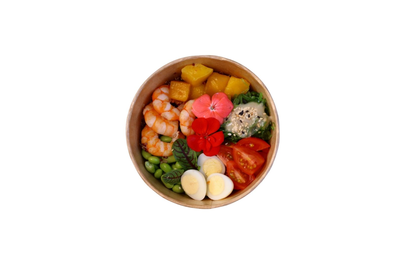 Креветки, кіноа, адамаме, манго, яйця перепелині, помідори чері, водорослі чука, кунжут ,горіховий соус, соус унагі.