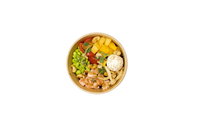 Лосось обпалений,хурма,гриби шиміджи,соєві боби едамаме,помідори черрі,крем сир,горіхи кешью,рис дикий,соус соєвий,соус манговий,кунжут.