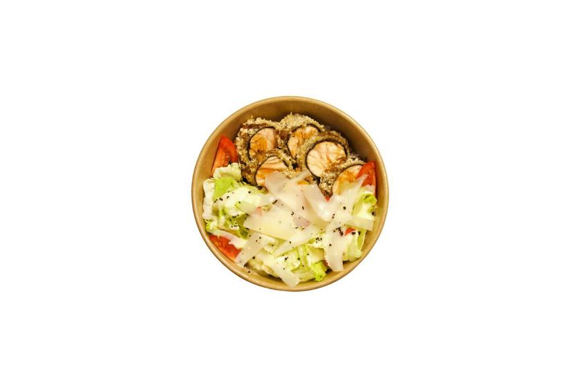 Філе лосося,рис варени,оцет рисовий,соус соэвий,соус манговий,салат айсберг,помідори черрі,соус цезар,пармезан,соус тонкатсо.