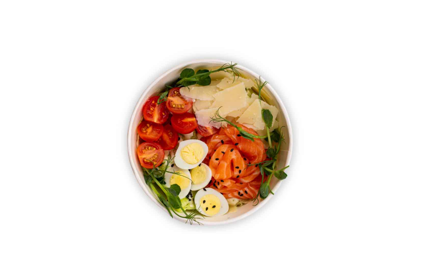 Салат Айсберг, салат Лолло Біонда,руккола, соус Цезар, свіжий лосось, помідори чері, перепелині яйця, пармезан,