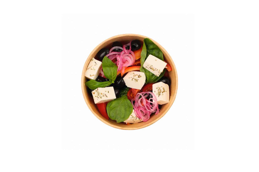 Черрі, болгарський перець, огірки, фета, цибуля синя, базилік, маслини, зелень мікрогрін, оливкова олія