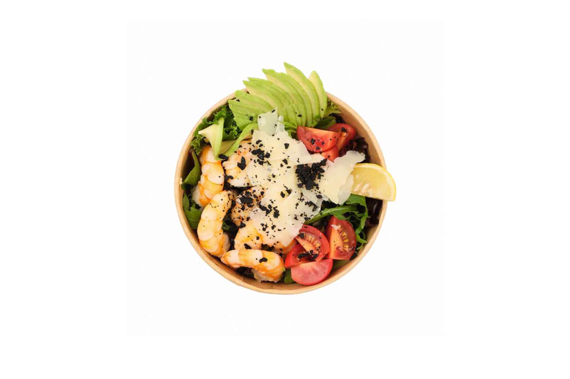 Смажені креветки, авокадо,лист салата, рукола, авокадо, томати,медово гірчична заправка, пармезан
