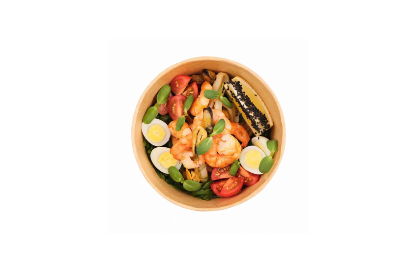 Кальмари, мідії, креветки, перепелине яйце, черрі, кунжут, соус унагі, соус устричний, лимон, часник
