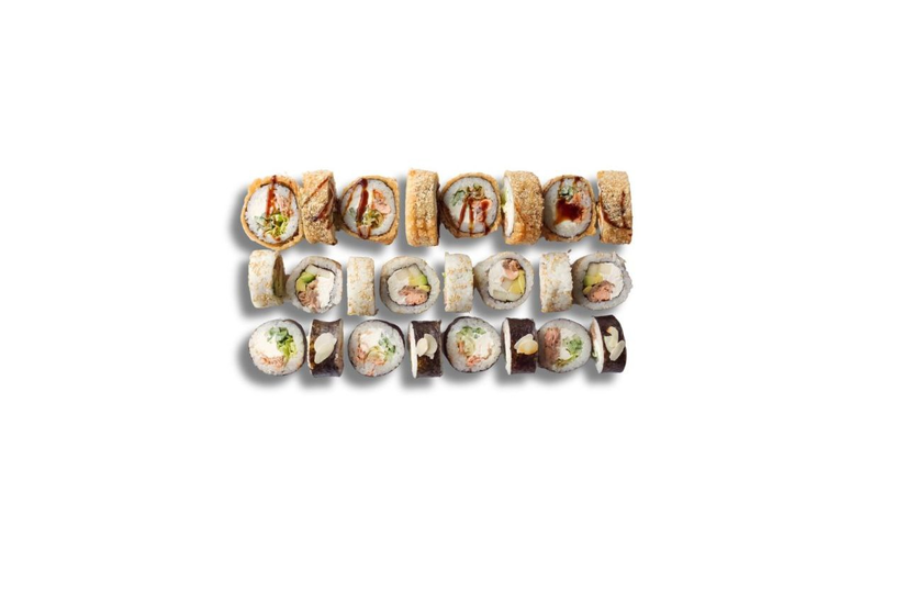 1. Філадельфія з лососем теріякі(Лосось теріякі, крем сир, груша, авокадо, кунжут, норі, рис,соус унагі)