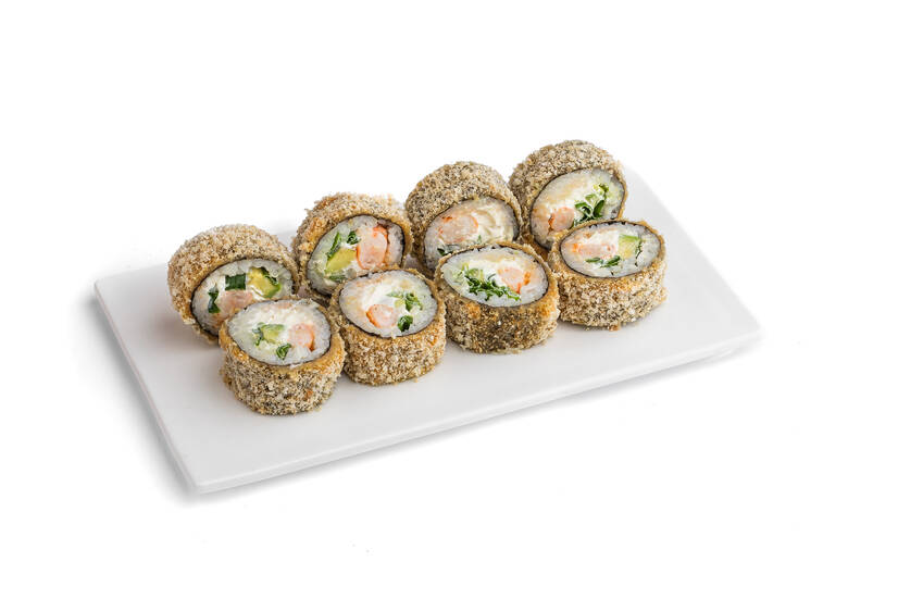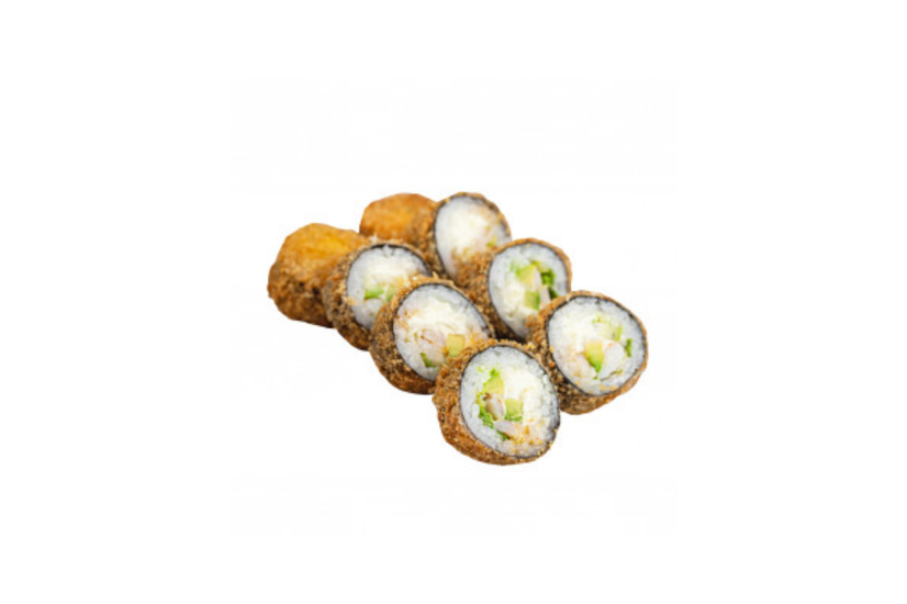 Креветки, соус спайсі, крем-сир, цибуля зелена, сухарі панко, норі, рис, авокадо.