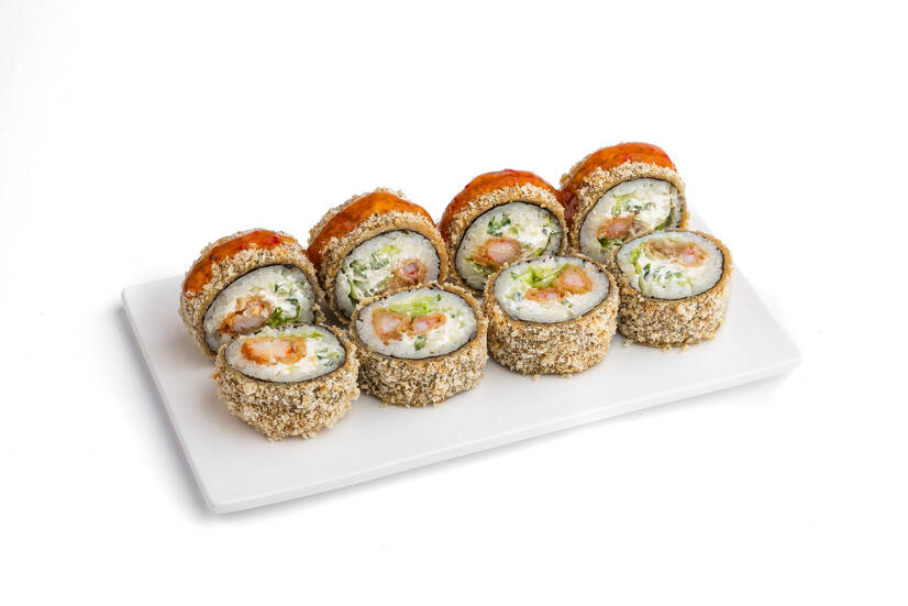 Креветка тигрова , огірок, соус солодкий чілі, крем-сир, сухарі панко, норі, рис,салат айсберг,соус сирний.