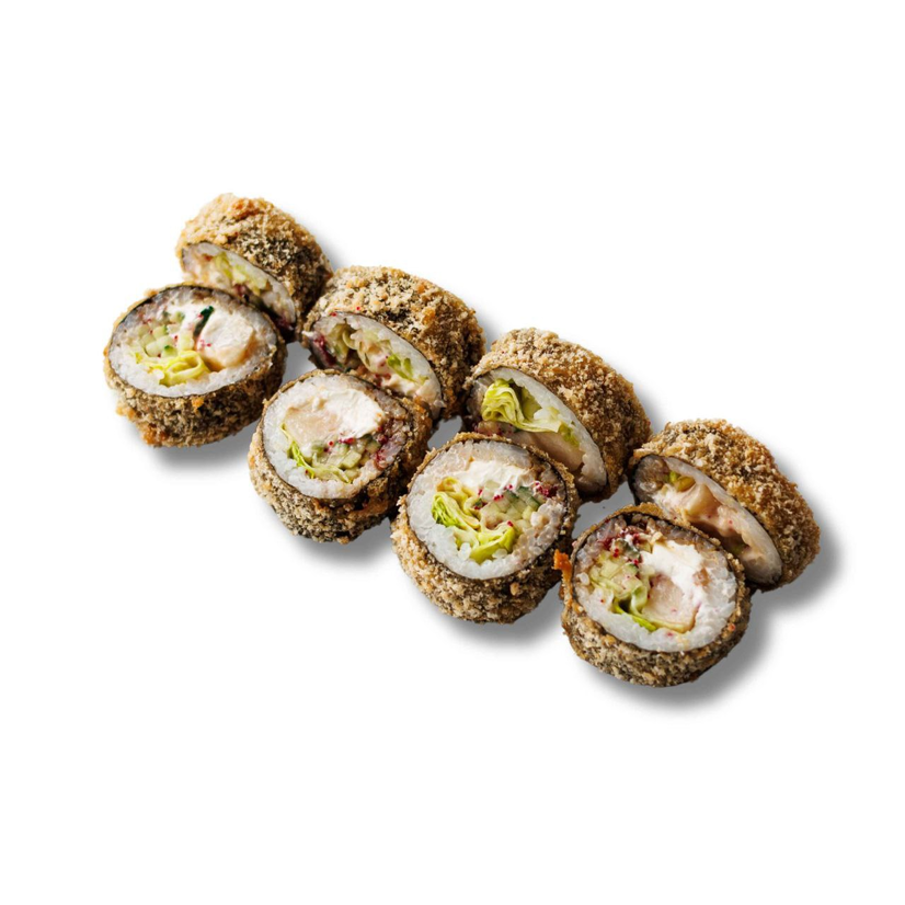 Морський гребінець, соус спайсі, крем-сир, огірок,соус сметанний, сухарі панко, норі, рис,салат айсберг,ікра тобіко чорна.